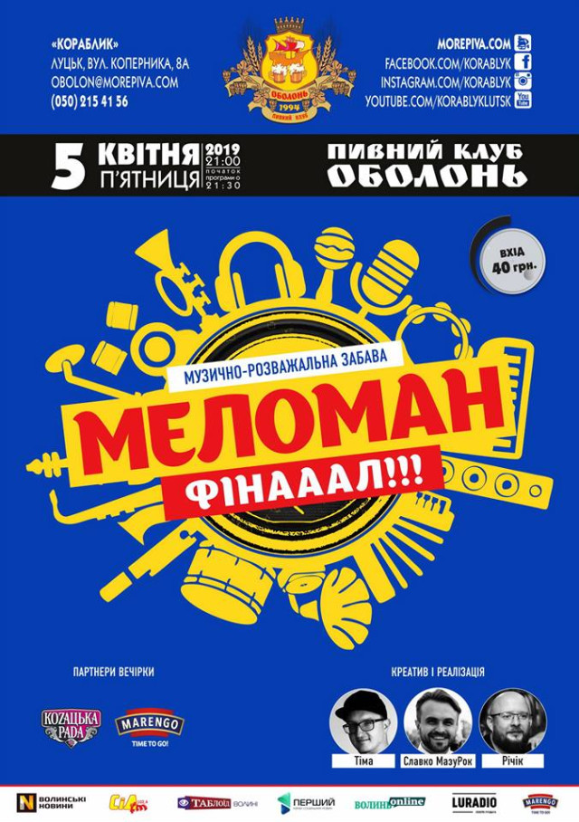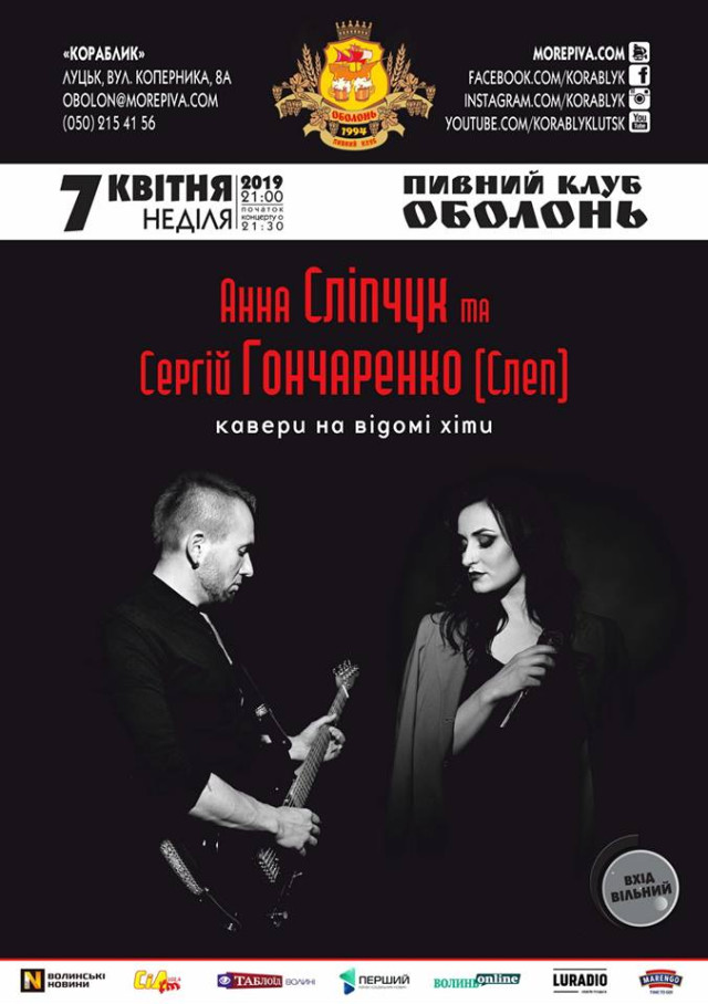 Фан-зустріч із акторами серіалу «Школа» в РЦ «Промінь» | 4 квітняМоноспектакль «Про що мовчать чоловіки, або Дикун FOREVER» у Палаці культури міста Луцька | 4 квітняПерша україномовна стендап-комедія в Палаці культури міста Луцька | 4 квітняМузично-розважальна забава «Меломан» у пивному клубі «Оболонь» | 5 квітняВистава «Ведмідь. Пропозиція» у Волинському обласному академічному музично-драматичному театрі імені Тараса Шевченка | 5 квітняБлагодійний бал Impreza Lubarta в Музеї сучасного українського мистецтва Корсаків | 5 квітняЛекція «Історія римо-католицької Церкви на Волині» в Центрі туристичної інформації та послуг | 5 квітняКонцерт «Смичком по клавішах» у Палаці культури міста Луцька | 5 квітняВиставка робіт Вікторії Романчук у РЦ «Промінь» | 5 квітняDILEMMA у клубі ХХІ століття | 6 квітняТренінг-кастинг театру-студії «Гармидер» у Луцькому районному будинку культури| 6 квітняСмачна дискотівка у пивному клубі «Оболонь» | 6 квітняВистава «Любов до скону» у Волинському обласному академічному музично-драматичному театрі імені Тараса Шевченка | 6 квітняThe Blast у пивному клубі «Майдан» | 6 квітняГерметичне коло Карла Звіринського: лекція у Музеї сучасного українського мистецтва Корсаків | 6 квітняВистава «Кордон» від театру-студії «Гармидер» у Луцькому районному будинку культури| 7 квітняАнна Сліпчук та Сергій Гончаренко. Кавери на відомі хіти в пивному клубі «Оболонь» | 7 квітняВистава «Дуже проста історія» у Волинському обласному академічному музично-драматичному театрі імені Тараса Шевченка | 7 квітняКонцерт симфонічного оркестру Lords of the Sound у Волинському обласному академічному музично-драматичному театрі імені Тараса Шевченка | 8 квітняПрезентація книжки Михайла Гереця «У світ широкий з Україною в серці» у Музеї історії Луцького братства | 9 квітняВівтоРОК з Анатолієм Вітинським у пивному клубі «Майдан» | 9 квітняРок-опера «Біла ворона» у Волинському обласному академічному музично-драматичному театрі імені Тараса Шевченка | 10 квітняМагія двох гітар. Акустичний вечір Юрія та Андрія Поліщуків у пивному клубі «Майдан» | 10 квітняКонцерт «Один день в Парижі» скрипаля-віртуоза Святослава Кондратіва в Палаці культури міста Луцька | 10 квітняВистава «Маруся Чурай» у Волинському обласному академічному музично-драматичному театрі імені Тараса Шевченка | 11 квітняПрезентація книжки Поліни Кулакової «Дівчина, яку ми вбили» у книгарні «Є» | 11 квітняIn ROCK: BEST ROCK & BLUES HITS у пивному клубі «Майдан» | 11 квітня