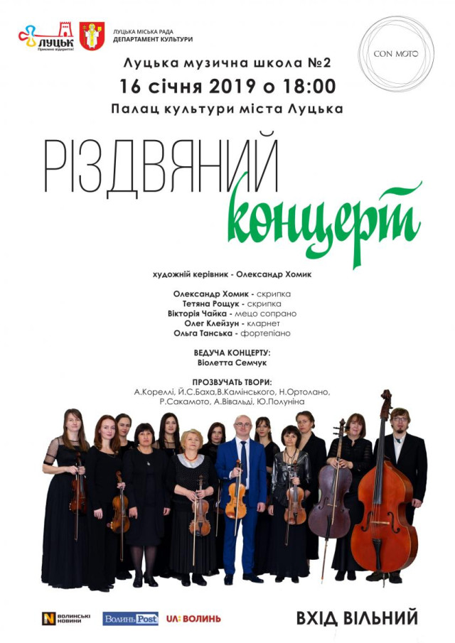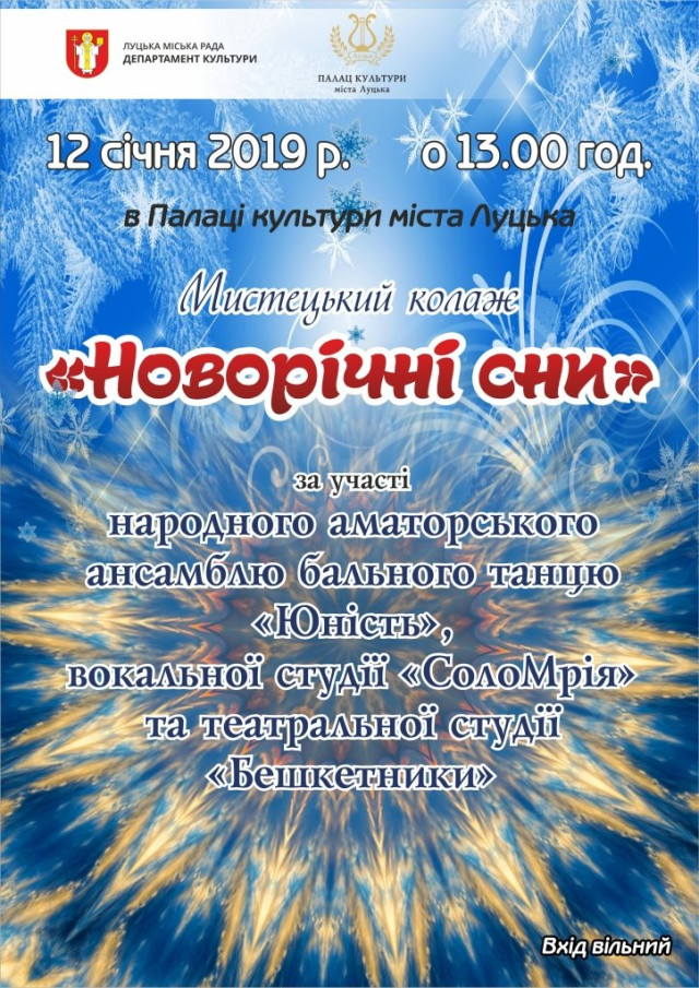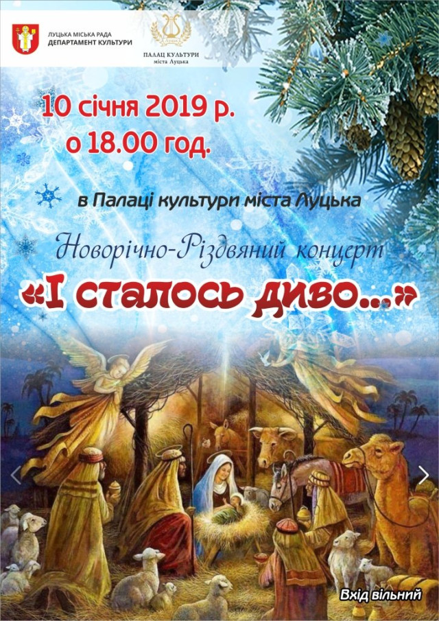 Новорічно-різдвяний концерт «І сталось диво...» у Палаці культури міста Луцька | 10 січняВистава «Циганка Аза» у Волинському академічному обласному українському музично-драматичному театрі імені Тараса Шевченка | 10 січняГоцалки в пивному клубі «Оболонь» | 11 січняStand-up комедія «Про що мовчать чоловіки, або Дикун Forever» у Палаці культури міста Луцька | 11 січняЧорні Черешні. Вечір гарної атмосфери та хорошої музики в пивному клубі «Майдан» | 11 січняВистава «Різдвяна ніч» у Волинському академічному обласному українському музично-драматичному театрі імені Тараса Шевченка | 11–12 січняЕтно-фестиваль "Різдво у Луцьку« на Театральному майдані міста Луцька | 12–13 січняМистецький колаж «Новорічні сни» в Палаці культури міста Луцька | 12 січня"URBAN PARTY" за участі ФІЛІН із презентацією альбому в пивному клубі «Оболонь» | 12 січняРіздвяне шоу «Коляда з Тетяною Ціхоцькою» у Волинському академічному обласному українському музично-драматичному театрі імені Тараса Шевченка | 13 січняВистава «Снігова королева» у Волинському академічному обласному театрі ляльок | 13 січняBeer Mix: дискотівка на будь-який смак у пивному клубі «Оболонь» | 13 січняСвятковий концерт Волинського державного академічного українського народного хору у Волинському академічному обласному українському музично-драматичному театрі імені Тараса Шевченка | 15–17 січняРіздвяний концерт камерного оркестру «Con Moto» в Палаці культури міста Луцька | 16 січняВистава «Обережно – жінки» у Волинському академічному обласному українському музично-драматичному театрі імені Тараса Шевченка | 17 січня