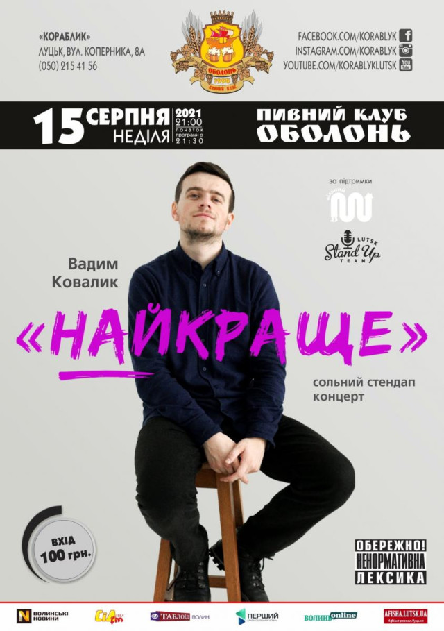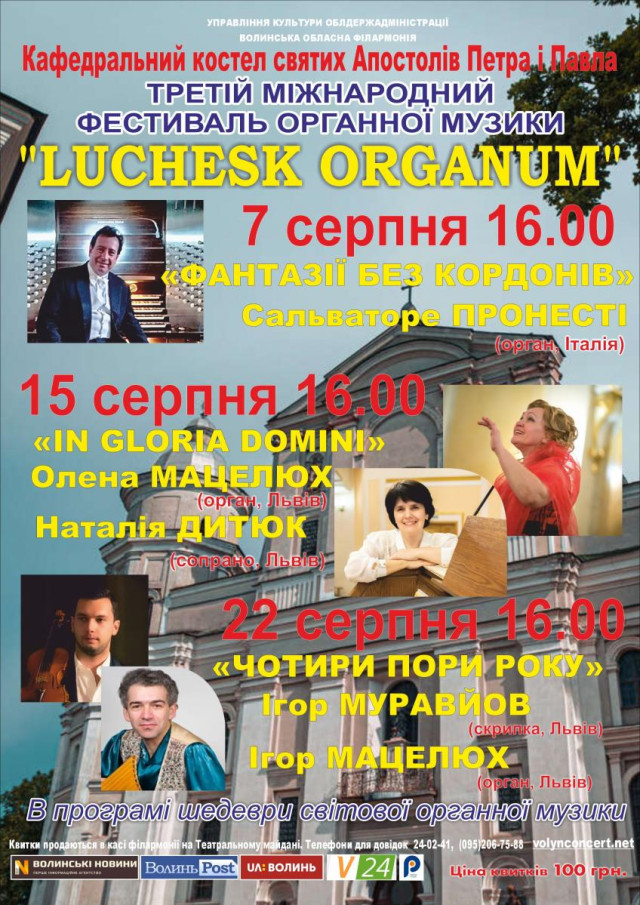«Без обмежень» NA PAGORBI. Офіційне відкриття закладу | 12 серпня«Нарешті п’ятниця!» у пивному клубі «Оболонь» | 13 серпняНічна велопрогулянка у Ківерцях | 13 серпняНаймасштабніший OPEN AIR фестиваль електронної музики Західної України SVITIAZ’ FEST у селі Світязь | 14 серпня«Дисколихоманка 70-80-90-х» у пивному клубі «Оболонь» | 14 серпняПоказ фільму «Домініон» у Молодіжному центрі Волині | 14 серпняФестиваль «З родинного джерела» у Жидичині та Рокинях | 14, 15 серпняТретій міжнародний фестиваль органної музики «Luchesk organum» у кафедральному костелі Святих Апостолів Петра і Павла | 15 серпняСольний стендап-концерт Вадима Ковалика «Найкраще» у пивному клубі «Оболонь» | 15 серпняЗустріч із психотерапевтом «Сексуальність як ресурс» у Луцьку | 18 серпняКонцерт Тіни Кароль у замку Любарта | 19 серпня