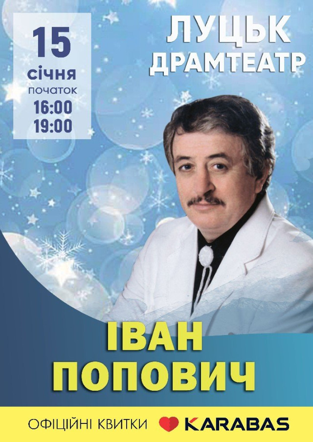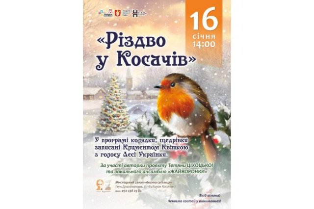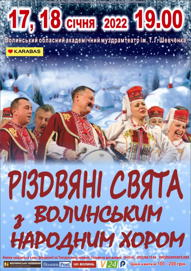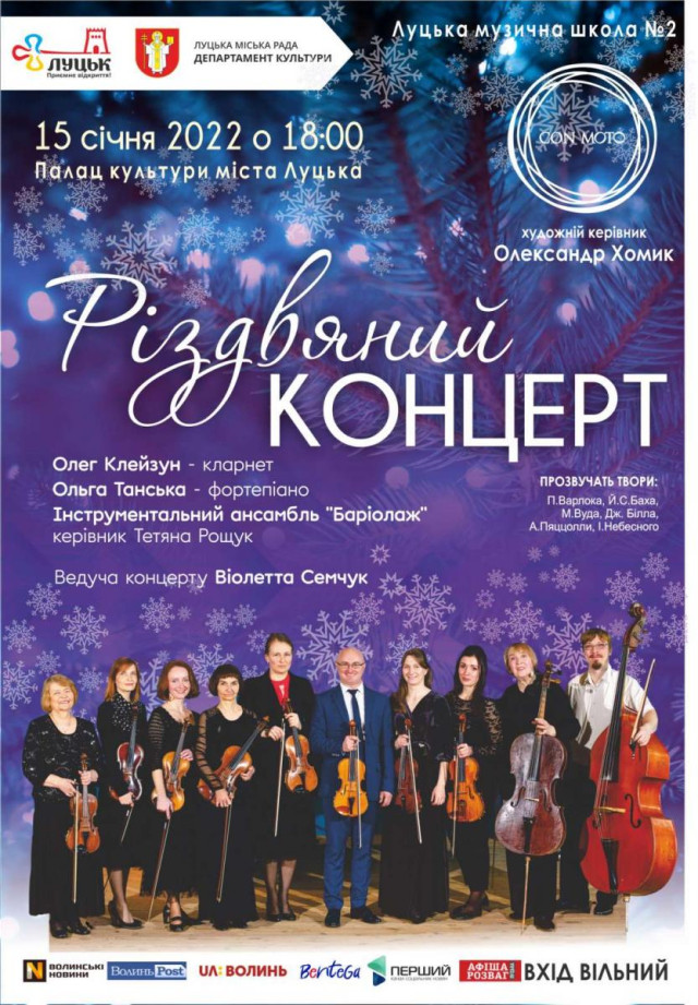 Архієрейський хор «Оранта» з різдвяною програмою «Тиша» у Гармидер ангар-stage | 14 січняВечорниці на свята Василя та Маланки в «Рестпарку» | 14 січняВистава «Різдвяна ніч» у Волинському академічному музично-драматичному театрі імені Тараса Шевченка | 14 січняРіздвяний концерт камерного оркестру «Con Moto» у Палаці культури міста Луцька | 15 січняКонцерт Івана Поповича «Щасливого Різдва» у Волинському академічному музично-драматичному театрі імені Тараса Шевченка | 15 січняВистава «Олеся» у Волинському академічному музично-драматичному театрі імені Тараса Шевченка | 15 січняВистава «Підкова на щастя» у Волинському академічному театрі ляльок | 16 січняФестиваль «Різдво у Луцькій родині» у місті Луцьку та приєднаних селах | 15-16 січняСвято «Різдво у Косачів» у мистецькому салоні «Лесина світлиця» | 16 січняКонцерт «Органна музика Різдва» у кафедральному костелі святих апостолів Петра і Павла | 16 січняКазка «Русалонька» у Волинському академічному театрі ляльок | 16 січня«Різдвяний концерт» у Волинському академічному музично-драматичному театрі імені Тараса Шевченка | 16, 19 січняВистава «Піколетто» у Волинському академічному театрі ляльок | 16 січняРіздвяні свята з Волинським народним хором у Волинському академічному музично-драматичному театрі імені Тараса Шевченка | 17, 18 січняВистава «Замовляю любов» у Волинському академічному музично-драматичному театрі імені Тараса Шевченка | 20 січня