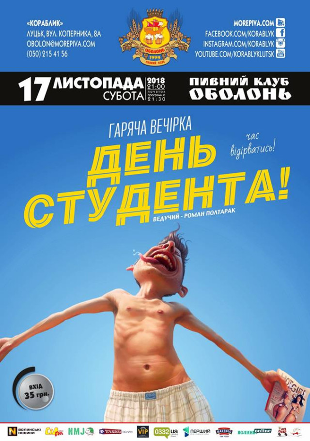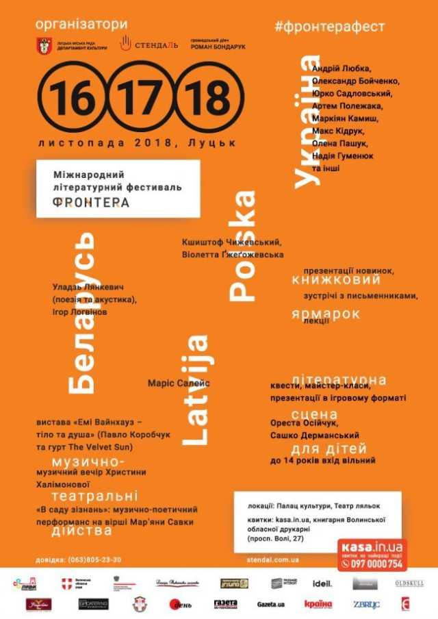 Відкриття виставки VIII Міжнародного пленеру іконопису та сакрального мистецтва в Замлинні на Волині «Знаки часу» | 15 листопадаКонцерт гурту KAZKA у нічному клубі «ХХІ століття» | 15 листопадаКонцерт Kiev Tango Project у Волинському обласному академічному музично-драматичному театрі імені Тараса Шевченка | 16 листопадаГоцалки в пивному клубі «Оболонь» | 16 листопадаВолонтерський концерт «Реабілітація» в Палаці культури міста Луцька | 16 листопадаВистава «На Івана Купала» у Волинському академічному обласному театрі ляльок | 16 листопадаВистава «Нестерпні люди, або Наречений з Єрусалиму» у Волинському обласному академічному музично-драматичному театрі імені Тараса Шевченка | 16 листопадаІ Міжнародний літературний фестиваль «Фронтера» | 16–18 листопада«День студента». Вечірка в пивному клубі «Оболонь» | 17 листопадQuizКОТЕка. Фінальна гра в ірландському пабі Laphroaig | 17 листопадЛекційний семінар для батьків «Маленькі діти: як їм живеться та про що думається» у Центрі психології та психотерапії | 17 листопадаВистава «Номер 13 (Неймовірні пригоди в готелі класу LUX)» у Волинському обласному академічному музично-драматичному театрі імені Тараса Шевченка | 18 листопадаКонцерт Джамали у РЦ «Промінь» | 18 листопадаВистава «Дитина в дарунок» у Волинському обласному академічному музично-драматичному театрі імені Тараса Шевченка | 18 листопадаКонцерт академічного камерного оркестру «Кантабіле» у Волинській обласній філармонії | 18 листопадаКонцерт гурту «Naviband» у Палаці культури міста Луцька | 18 листопадаКонцерт гурту «YEGANOV PROJECT» у пивному клубі «Оболонь» | 18 листопадаВистава «Вінні Пух і всі, всі, всі...» у Волинському академічному обласному театрі ляльок | 18 листопадаВистава «Стережися лева» у Волинському обласному академічному музично-драматичному театрі імені Тараса Шевченка | 18 листопадаФайна гутірка з Маєю Москвич у магазині туристичного спорядження «Альпініст» | 19 листопадаКонцерт гумористичного дуету «Брати Шумахери» у РЦ «Промінь» | 20 листопадаВистава «Про що мріють зірки» у Волинському академічному обласному театрі ляльок | 22 листопадаТиждень українського кіно в кінотеатрі Адреналін | 22 листопадаКонцерт гурту «Бумеранг» у Палаці культури міста Луцька | 22 листопада