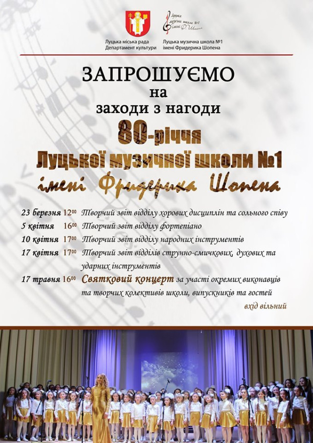 «Lutsk night cinema» у Волинському краєзнавчому музеї | 16 травняГоцалки в пивному клубі «Оболонь» | 17 травняPERSONAL BRANDING у центрі Passage Interdit | 17 травняЛекція «Як інвестувати в мистецтво» в Академії сучасного мистецтва | 17 травняКороль та Королева Луцького НТУ 2019 у Волинському академічному обласному музично-драматичному театрі імені Тараса Шевченка | 17 травняРетро-фольк квартет «Стара Шухляда» у пивному клубі «Майдан» | 17 травняВистава «Про що мріють зірки» у Волинському академічному обласному театрі ляльок | 17, 19 травняДень Європи у Луцьку | 18 травняНіч у музеї, чи Нічний катарсис у Музеї сучасного українського мистецтва Корсаків | 18 травня25 день народження «Кораблика» в пивному клубі «Оболонь» | 18 травняМіжнародна акція «Ніч музеїв» у Волинському краєзнавчому музеї | 18 травняСвятковий концерт з нагоди 80-річчя школи № 1 імені Фридерика Шопена | 18 травняФестиваль безпритульних собак #мокріносики в РЦ «Промінь» | 19 травняРитмотека в пивному клубі «Оболонь» | 19 травняЛекція «Музика та музиканти на З'їзді монархів у Луцьку» в Центрі туристичної інформації та послуг | 19 травня«Дизель-шоу» у Волинському академічному обласному музично-драматичному театрі імені Тараса Шевченка | 20 травняВистава «Бджілка» у Волинському академічному обласному музично-драматичному театрі імені Тараса Шевченка | 22 травняВистава «Шельменко-денщик» у Волинському академічному обласному музично-драматичному театрі імені Тараса Шевченка | 23 травня