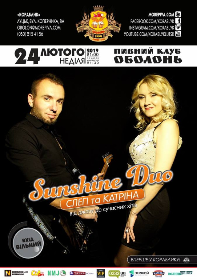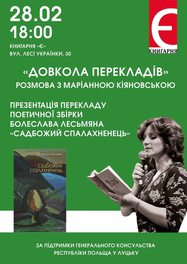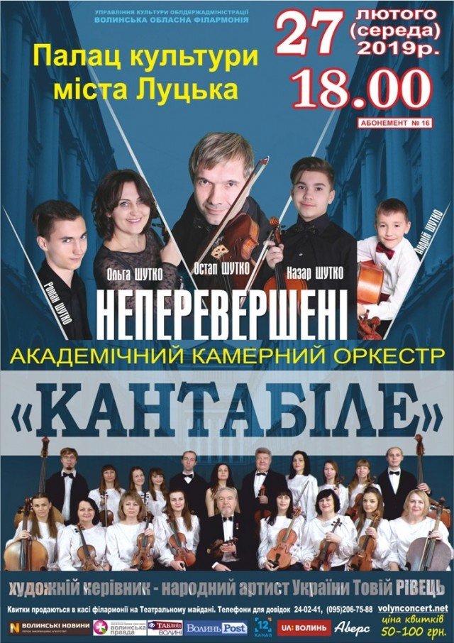 Вистава «Про що мовчать чоловіки, або Дикун FOREVER» у Палаці культури міста Луцька | 22 лютогоНарешті п’ятниця! Відривна дискотівка в пивному клубі «Оболонь» | 22 лютогоВиставка Робіт Павла Варварика «Кольорова емоція» в РЦ «Промінь» | 22 лютогоПерегляд добірки найкращих короткометражних фільмів за версією Британської кіноакадемії «BAFTA: Британія. Коротко 2018» у Молодіжному центрі Волині | 22 лютогоПостановка «Сім струн» у Волинському обласному академічному музично-драматичному театрі імені Тараса Шевченка | 22 лютогоМистецький проект «Сторожа» в Галереї мистецтв | 22 лютогоЗустріч із тренером Всесвітньої федерації асоціацій туристичних гідів Геннадієм Чудновцем» Сучасні тренди в екскурсійній діяльності» в Центрі туристичної інформації | 22 лютого«Чорні черешні». Вечір гарної атмосфери та хорошої музики в пивному клубі «Майдан» | 22 лютогоOld School. Перевірені часом хітяри в пивному клубі «Оболонь» | 23 лютогоОнлайн лекція з голівудським фотографом Terence Patrick у ГО «Центр візуальної освіти» | 23 лютогоКонцерт Jazz love forever у Палаці культури міста Луцька | 23 лютогоЛекція «Концептуалізм 60–70-ті. Дискваліфікація мистецтва» в Музеї сучасного українського мистецтва Корсаків | 23 лютогоВистава «Любов до скону» у Волинському обласному академічному музично-драматичному театрі імені Тараса Шевченка | 23 лютогоВистава «Апокрифи» від «Гармидера» у Луцькому районному будинку культури | 24 лютогоВиступ гурту «SUNSHINE DUO. СЛЕП та КАТРІНА» в пивному клубі «Оболонь» | 24 лютогоВистава «Лісова пісня» у Волинському обласному академічному музично-драматичному театрі імені Тараса Шевченка | 24 лютогоКонцерт Lukewarm Ocean в пивному клубі «Майдан» | 24 лютогоВистава «Як горобець розуму шукав» у Волинському обласному академічному театрі ляльок | 24 лютогоВистава «Біда навчить» у Волинському обласному академічному музично-драматичному театрі імені Тараса Шевченка | 24 лютогоВистава «Камінний господар» у Волинському обласному академічному театрі ляльок | 25, 26 лютогоПоза екраном. Зустріч із керівником ТО «Ранок» UA: Волинь у Молодіжному центрі Волині | 26 лютогоКонцерт «Неперевершені» за участю сім’ї Шутків та Академічного камерного оркестру «Кантабіле» Волинської обласної філармонії в Палаці культури міста Луцька | 27 лютогоПрезентація перекладу поетичної збірки Болеслава Лесьмяна «Садбожий спалахненець». «Довкола перекладів» – розмова з Маріанною Кіяновською у книгарні «Є» | 28 лютого