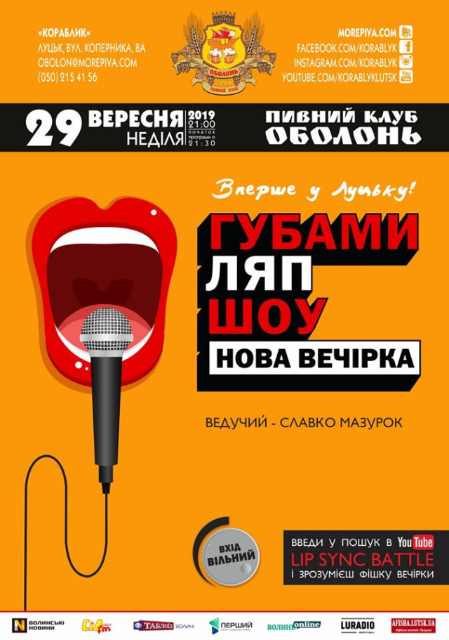 Customer Journey Map або збільшення ефективності продажів у бізнес-центрі «Passage Interdit» | 26 вересняПоказ циклу документальних фільмів «Неzламні» в Палаці культури міста Луцька | 27 вересняРадiоХiти. Танцi в пивному клубі «Оболонь» | 27 вересняВистава «Повернення в Соренто» у Волинському академічному театрі імені Тараса Шевченка | 27 вересняКороткий метр про планету у Волинському краєзнавчому музеї | 27 вересняMery D White у клубі «Цитра» | 27 вересняРетро танці в пивному клубі «Оболонь» | 28 вересняLutsk Fashion Weekend на West Auto Hub | 28 вересняВистава для дітей «Кит і равлик» у Волинському академічному обласному театрі ляльок | 28 вересняДраматична поема «Присмерк» у Волинському академічному театрі імені Тараса Шевченка | 28–29 вересняКонцерт Олі Полякової в РЦ «Промінь» | 29 вересняФестиваль безпритульних тварин Мокрі носики 2.0 біля РЦ «Промінь» | 29 вересняВистава «День народження кота Леопольда» у Волинському академічному театрі імені Тараса Шевченка | 29 вересняЗабава «ГУБАМИ ЛЯП ШОУ» у пивному клубі «Оболонь» | 29 вересняВистава «Гусеня» у Волинському академічному обласному театрі ляльок | 29 вересняПоказ стрічки «Moje córki krowy» («Мої дочки – корови») у Multiplex | 30 вересняКонцерт «Мирослав Скорик: учні і послідовники» у Волинській обласній філармонії | 1 жовтняПрезентація роману-горору Ксенії Циганчук «По то бік пам'яті» у книгарні «Є» | 1 жовтняПотік клієнтів із Facebook та Instagram у бізнес-центрі «Passage Interdit» | 1 жовтня