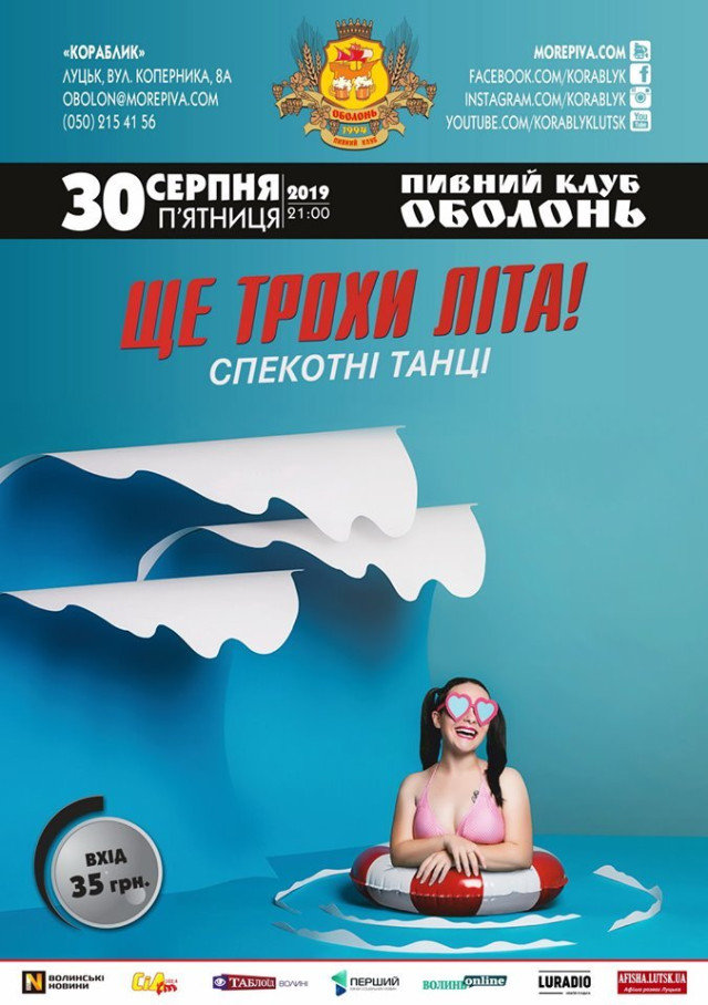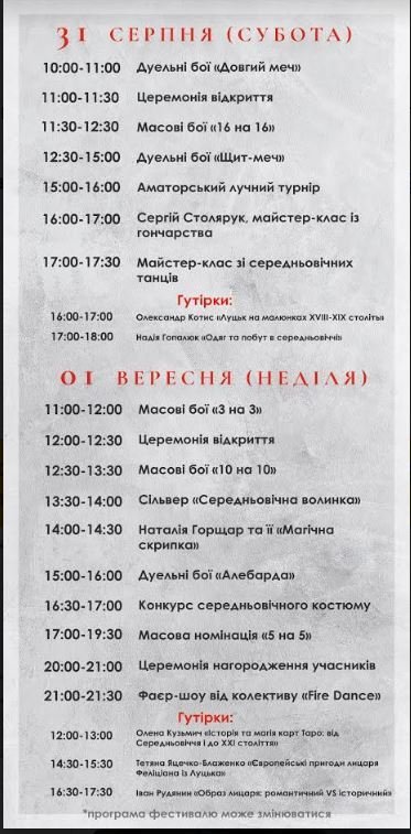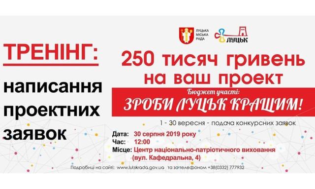 Навчання з написання проєктних заявок у Центрі національно-патріотичного виховання | 30 серпняЩе трохи лiта! Танцi в пивному клубі «Оболонь» | 30 серпняМіжнародний джазовий фестиваль Art Jazz 2019 у Луцькому замку | 30–31 серпняКавьор-паті. Вечір кантрі в пабі «Oldskull» | 31 серпняВиставка картин Миколи Ампілогова New WAY у РЦ «Промінь» | 31 серпняТiльки Хiти. Танцi в пивному клубі «Оболонь» | 31 серпняКубок України зі середньовічного бою «Середньовічний Лучеськ. Доблесть віків» у замку Любарта | 31 серпня – 1 вересняГурт «OUTCRY» у пивному клубі «Оболонь» | 1 вересняЛекція «Чому комунікації важливі?» у Молодіжному центрі Волині | 4 вересня