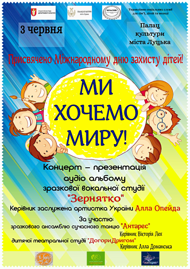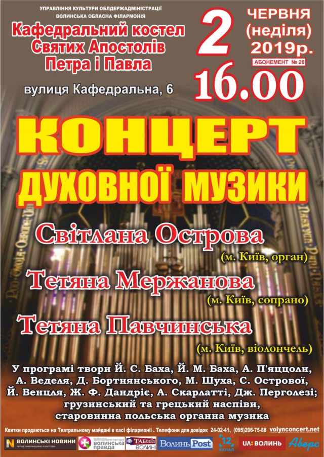 Другий молитовний сніданок у Волинському обласному академічному музично-драматичному театрі імені Тараса Шевченка | 31 травняАрт-променад «Так звучить Луцьк» від Театрального майдану | 31 травняТільки хіти. Танці в пивному клубі «Оболонь» | 31 травняУрочистості з нагоди 25-ї річниці ВЧ 1141 НГУ в Палаці культури міста Луцька | 31 травня«Чорні черешні». Вечір гарної атмосфери та хорошої музики в пивному клубі «Майдан» | 31 травняLa Piano – Вечір лірики та вина у клубі «Цитра» | 1 червняРетро-танці в пивному клубі «Оболонь» | 1 червняКарнавал повітряних куль «Аеросфера 2019» на території колишнього іподрому (парк імені Лесі Українки) | 1–2 червняГала-концерт учасників обласного телевізійного пісенного конкурсу «Співай за мрію»на Театральному майдані | 1–2 червняСвято морозива від компанії «Рудь» у центральному парку | 2 червняКонцерт духовної музики у кафедральному костелі Святих Апостолів Петра і Павла | 2 червняДень відкритих дверей до Міжнародного дня захисту дітей у Волинському краєзнавчому музеї | 2 червняВистава «Любов до скону» у Волинському обласному академічному музично-драматичному театрі імені Тараса Шевченка | 2 червняГурт «OUTCRY» в пивному клубі «Оболонь» | 2 червняВистава «Чарівна лампа Аладдіна» у Волинському обласному академічному музично-драматичному театрі імені Тараса Шевченка | 2 червняКонцерт-презентація аудіоальбому зразкової вокальної студії «Зернятко» в Палаці культури міста Луцька | 3 червня