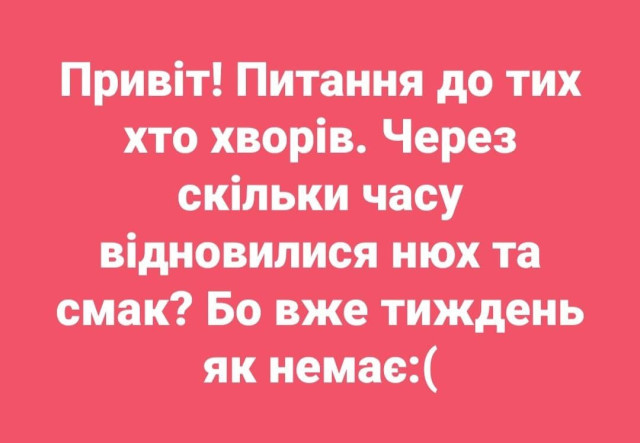 «Бо ось уже тиждень, як немає», – бідкається дівчина.На це користувачка Євгенія, яка дописує у соцмережі під нікнеймом Jane MP розповіла, що навіть після десяти місяців після захворювання нюх у неї так і не відновився.