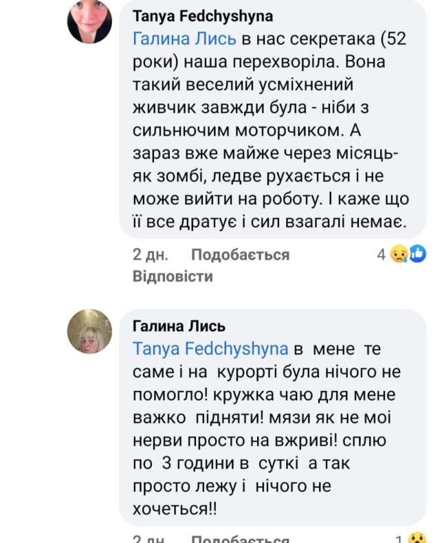 Натомість, користувачка Тетяна Федчишина їй відповіла, що подібні симптоми є й в 52-річної секретарки з її роботи, яка також перехворіла на COVID-19.