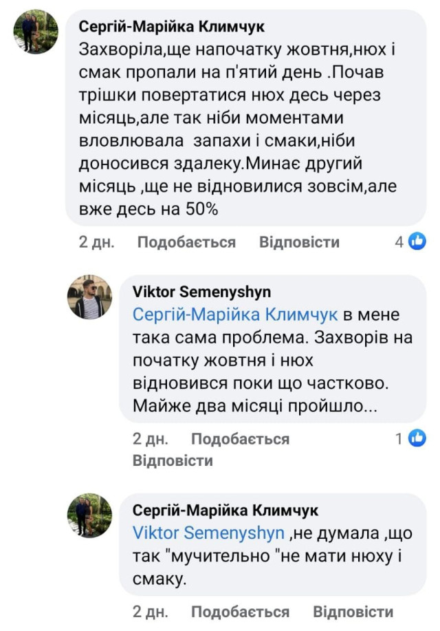 Водночас, користувачка Ірина Оксентюк скаржиться, що не відчуває запахів із з квітня 2020 року. «Точніше в кінці квітня пропав, через місяць – півтора відновився на 20%, а з першого вересня, змінився – мозок не правильно читає запахи і смаки. Мене до сих пір переслідує запах і смак бензину, чи то ацетону, чи металу. Інколи доводить до сказу. Але я не втрачаю надії, думаю через рік стане на місце... Раніше любила оселедець, а тепер тільки підношу улюблену страву до рота – одразу біжу випльовувати у смітник», – каже ковельчанка.