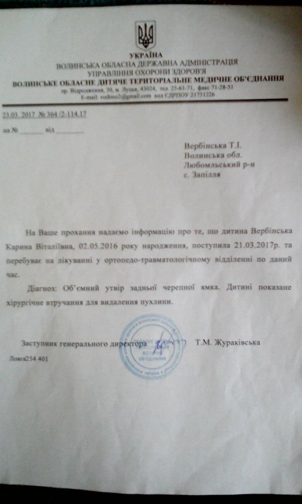 “Моїй двоюрідній сестричці, донечці мого брата, Вербінській Каріні Віталіївні поставили страшний діагноз : об’ємний отвір задньої черепної ямки. Дівчинці 10 місяців. Дитині показане складне хірургічне втручання для видалення пухлини.
