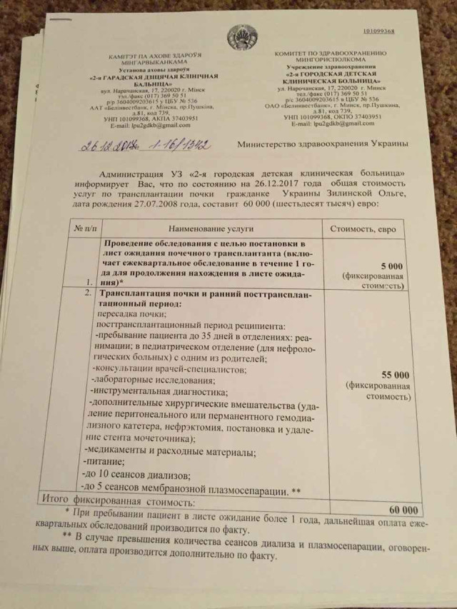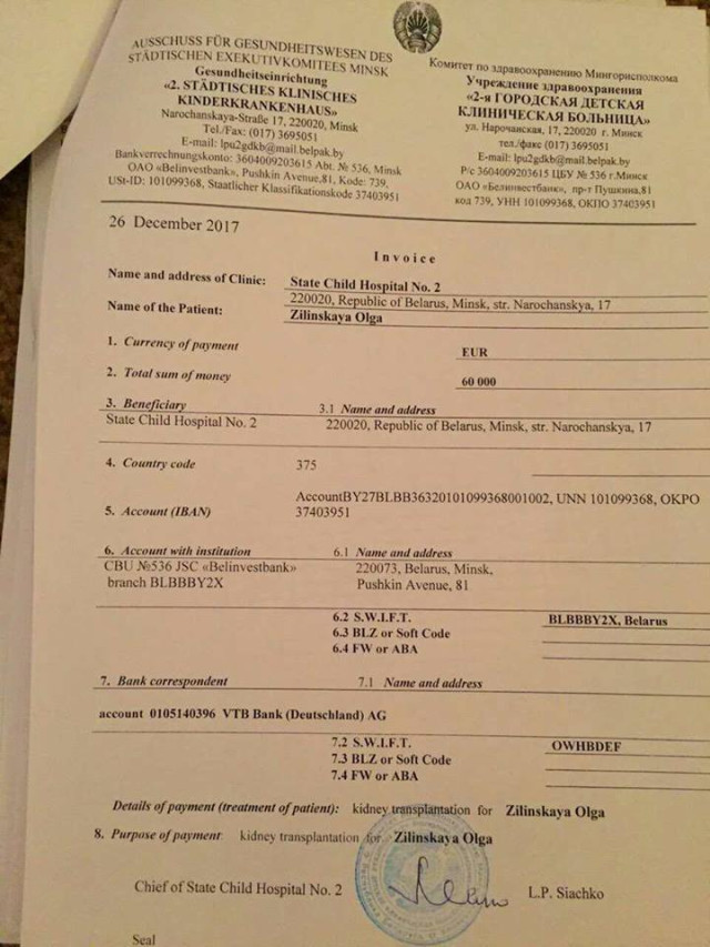 Приватбанк 5168742709253664 (мама Зілінська Олеся Василівна).Виписний листРахунок на операціюреквізити лікарніДіагноз