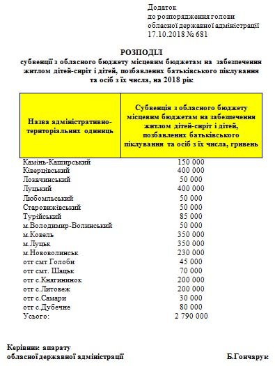З метою вирішення питання депутатський корпус Волинської обласної ради у лютому 2017 року затвердив цільову соціальну Програму забезпечення житлом дітей-сиріт та дітей, позбавлених батьківського піклування та осіб з їх числа на 2017-2021 роки. Програма передбачає щорічне виділення коштів із обласного та місцевих бюджетів для придбання житла. Зокрема, в поточному році з обласного бюджету на Програму виділено 2,8 млн. грн.