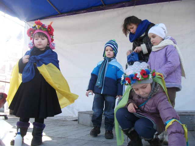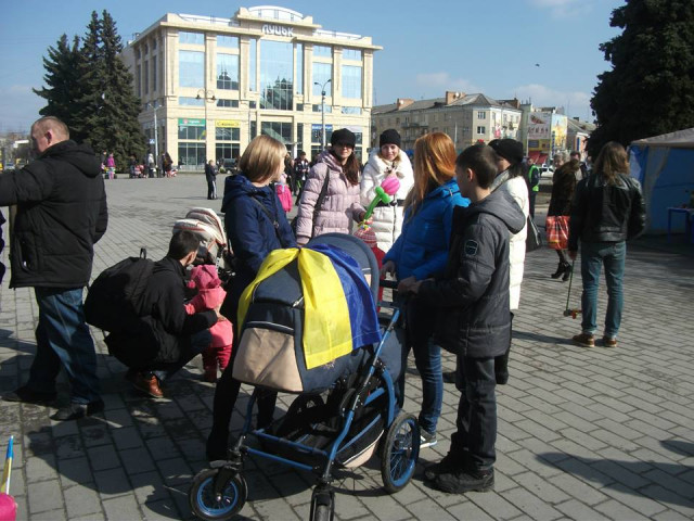 На Театральному майдані зібралося чимало матусь з дітками різного віку. Вони принесли з собою власноруч виготовлені плакати із написами про мир і Україну.