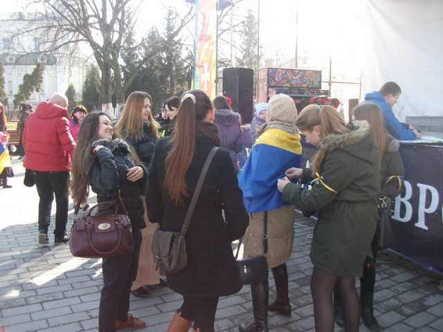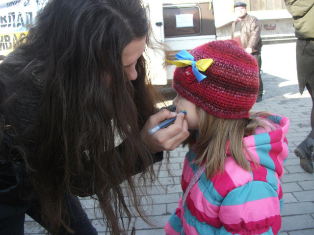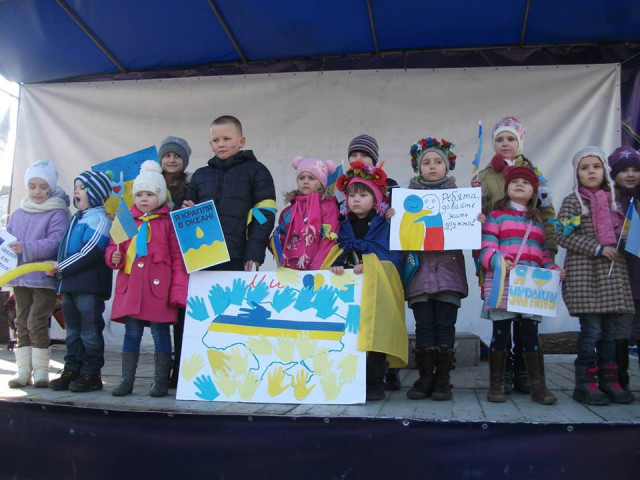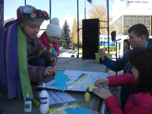 Батьки та їхні діти активно долучилися до акції, метою якої є показати всьому світу, що українці за мир, а наше місто - за мирну Україну. Усі учасники прийшли з національними символами України (синьо-жовтими стрічками, віночками, прапорцями тощо), багато людей були у вишиванках.