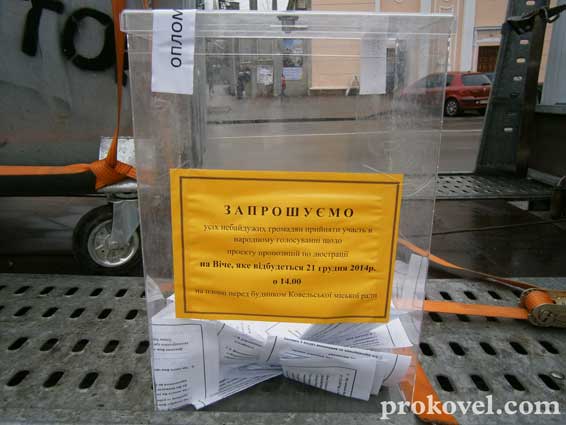 Народні люстратори наразі поводять себе спокійно, не мітингують, не скандують жодних лозунгів. Вони лише розповсюджують запрошення на Віче, яке відбудеться 21 грудня о 14 годині на цій же площі, і листівки-анкети. Просять перехожих відповісти на кілька важливих для них запитань. Таким чином організатори майбутнього зібрання хочуть сформувати думку ковельчан щодо роботи чиновників, представників освіти, медицини, правоохоронних органів і все це обговорити на недільному Вічі. Обіцяють, що привезуть і сміттєвий бак.