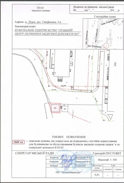 Так, луцькі обранці громади розглянули заяву КП «Луцький центр первинної медичної допомоги №3», що знаходиться на вулиці Стефаника, 3 щодо розроблення проєкту землеустрою для відведення земельних ділянок орієнтовною площею 0,01 га та 0,51 га для будівництва та обслуговування будівель закладів охорони здоров'я та соціальної допомоги – у цьому випадку гаража.