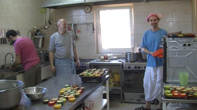 Кухня волонтерів з міжнародної організації «Їжа життя» працює щодня, каже її керівник Віктор Скороход.«Втілюємо цей проєкт більш як рік. Передаємо в лікарню психіатричну. А зараз щодня готуємо ці от смачні солодкі кекси і розповсюджуємо у волонтерські організації, які відправляють їх по всій Україні», – розповів чоловік. За день волонтери випікають 600-750 кексів.Після випічки усі можуть взяти по кілька кексів з собою. Бере їх і Олександра Іванівна. Каже: занесе доньці, бо та ходить на кухню не щодня. Лариса Кириченко – художниця – реставраторка. Через поспішний переїзд з Києва жінка не змогла взяти професійні інструменти.