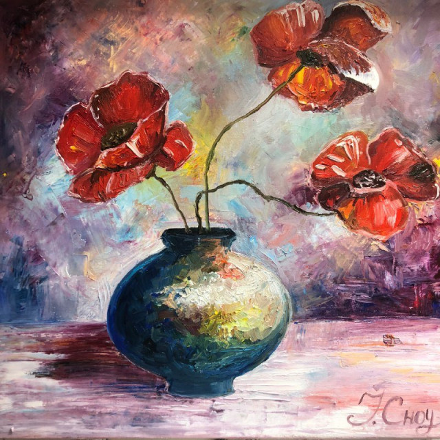 «Лот: картина олійними фарбами 40×40 см пд. назвою «Квіти добра». Зібрані кошти буде спрямовано на лікування дівчинки, – каже Інна. – Аукціон триватиме три дні і ви зможете вибороти можливість отримати картину і водночас допомогти сім’ї».