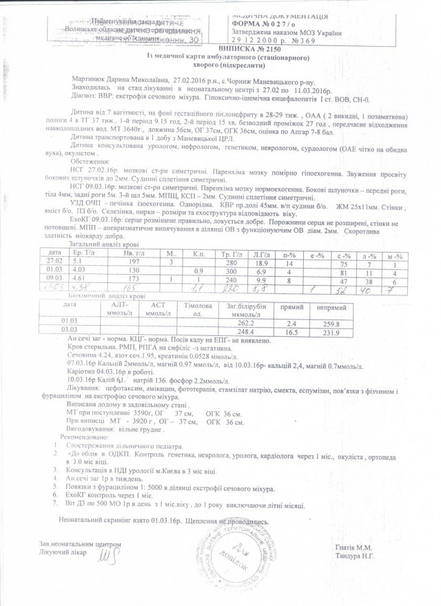 Даринка Мартинюк народилася 27 лютого у селі Чорниж Маневицького району. Дівчинці з першого дня народження поставили страшний діагноз: ВВР: екстрофія сечового міхура, гіпоксично-ішемічна енцефалопатія І ст. ВОВ, СН-0. Якщо пояснити простими словами, то вона народилася практично без сечового міхура.
