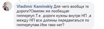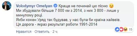 Свій коментар під цим постом залишив міністр інфраструктури України Володимир Омелян, який запевнив, що жоден уряд не побудував стільки доріг, як уряд Гройсмана.Омеляну дотепно відповіли учасники: