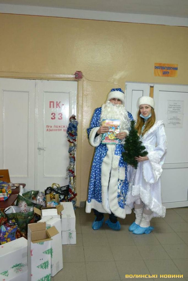 Малечі принесли альбоми та розмальовки. Солодощів та інших новорічних ласощів в мішку Діда Мороза не виявилось, адже хворим потрібно дотримуватись строгої дієти. Проте, зі слів організаторів, це зовсім не засмутило малят, оскільки натомість їм принесли ялинки та маленьких саморобних ангелів, який зробили для них вихованці Палацу учнівської молоді міста Луцька.