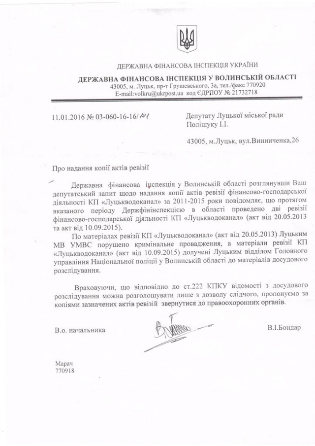 «За матеріалами ревізії КП «Луцькводоканал» (акт від 20.05.2013) Луцьким МВ УМВС порушено кримінальне провадження, а матеріали ревізії КП «Луцькводоканал» (акт від 10.09.2015) долучені Луцьким відділом Головного управління Національної поліції у Волинській області до матеріалів досудового розслідування», - йдеться у відповіді на запит.