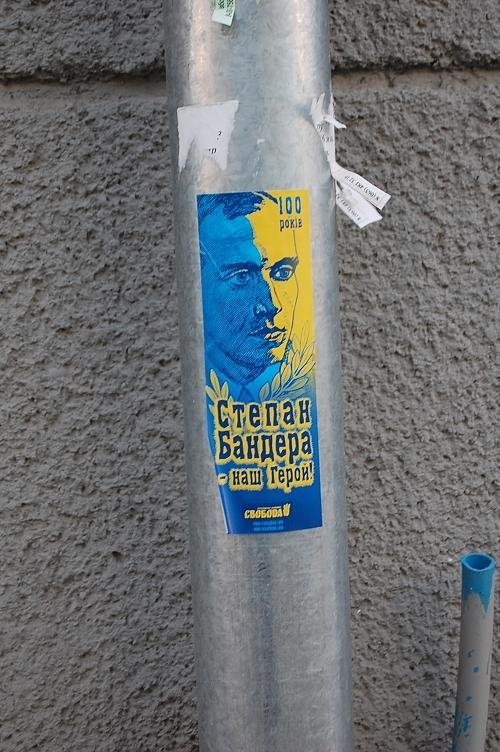 Крім того, на вулиці, названій на честь Провідника ОУН, видніються наклейки ВО «Свобода» під назвою «Степан Бандера – наш Герой».