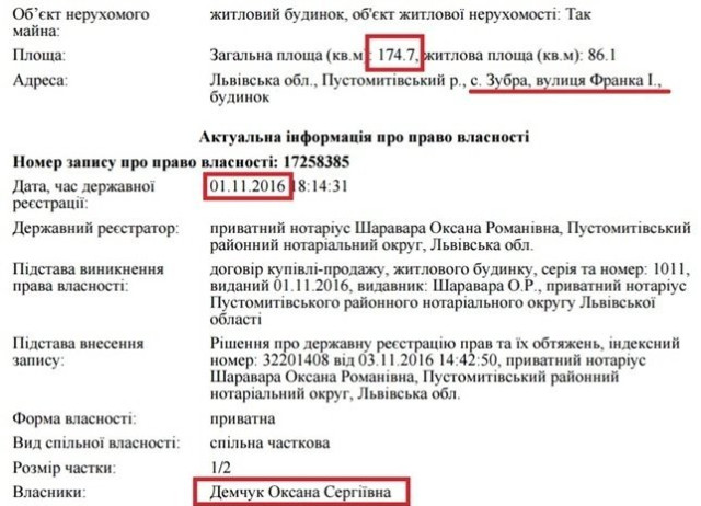 Так, 27-річна Оксана Демчук (дівоче Гриценко) 1 листопада 2016 року придбала половину будинку площею 174,7 кв м в селі Зубра Львівської області. Іншим співвласником ймовірно є зять митника – Павло Демчук.Також в реєстрі нерухомості вказано, що тоді ж вони придбали і ділянку в Зубрі площею 0,0807 га, а Оксана Демчук стала власницею ще 0,007 га. 15 грудня вона також оформила право користування земельною ділянкою поруч для проходу і проїзду (площа 0,0217 га).