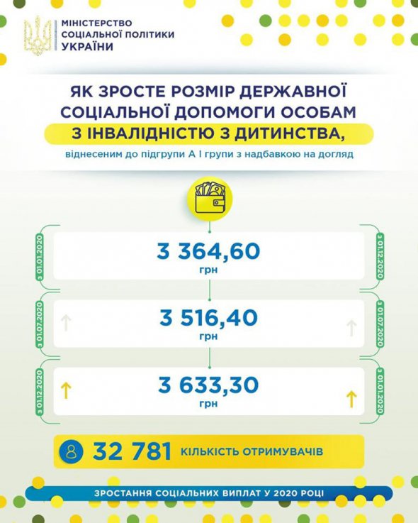 Розмір державної соціальної допомоги особам з інвалідністю з дитинства, віднесеним до підгрупи А I групи з надбавкою на догляд буде поступово підвищено до кінця цього року.