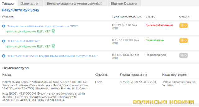 Замовником ремонту виступає ДП «Служба МАД у Волинській області», підприємство оголосило торги 25 червня 2020 року. А вже 17 липня комітет визначив переможця. Ним стало ТОВ «Вельт Капітал».