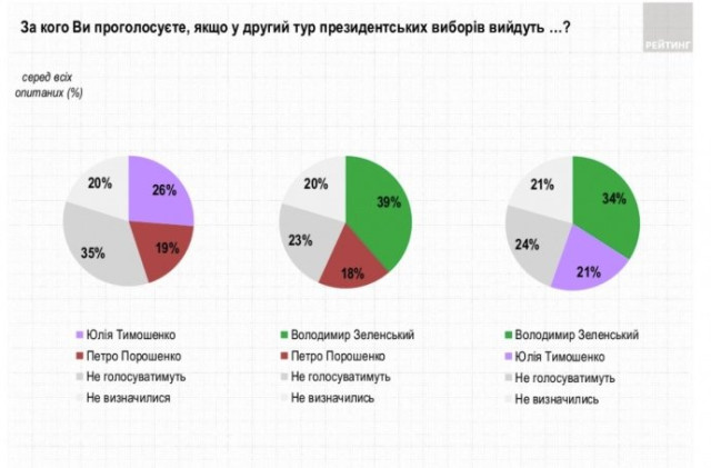 Так, згідно з останнім опитуванням Київського міжнародного інституту соціології, проведеним з 14 по 22 березня, 47,4% прихильників Юлії Тимошенко у випадку її програшу на виборах 31 березня у другому турі готові підтримати Володимира Зеленського.