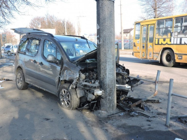 Як розповіли поліцейські, які працюють на місці аварії, «Сітроен» підрізав «Фольксваген Транспортер». Бусик притиснув легковика до правої бровки. Водій, аби уникнути сильного зіткнення, спрямував машину на тротуар. Рух машини зупинив бетонний стовп. Сила удару була настільки сильною, що перед іномарки зім’ятий повністю.