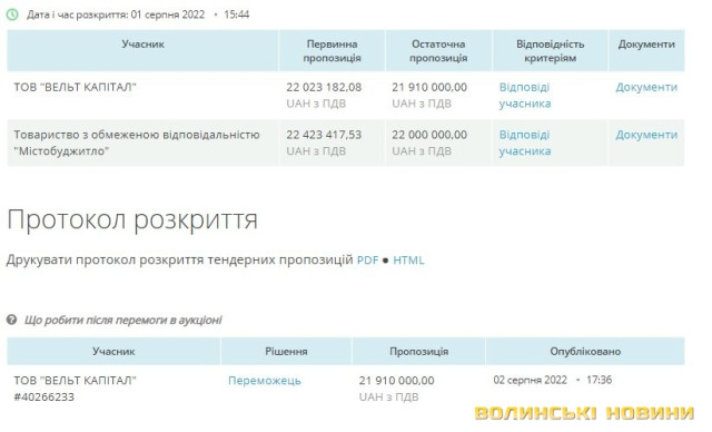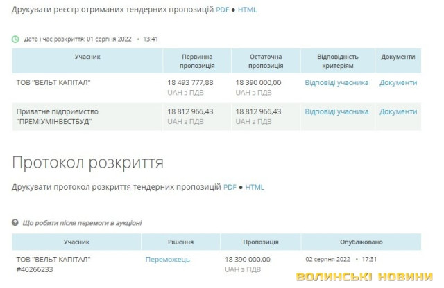 В обох тендерах перемогло ТзОВ «Вельт Капітал», яке запропонувало нижчу вартість робіт: 22 023 182,08 гривні і 18 390 000 гривень відповідно.