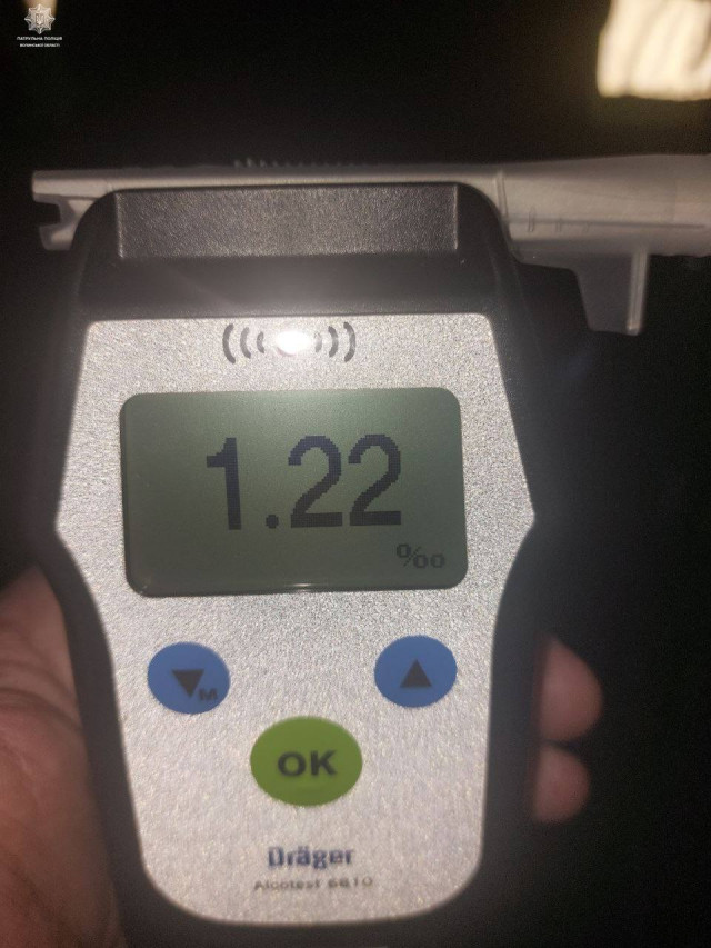 Патрульні також отримали повідомлення про ДТП, яка сталася на автодорозі Н-17 поблизу села Чаруків. З’ясувалося, що 32-річний керманич не впорався з керуванням та наїхав на рекламний щит, унаслідок чого злетів у кювет.Під час спілкування із водієм поліцейські помітили ознаки алкогольного сп’яніння. «Драгер» показав 1,22 проміле.