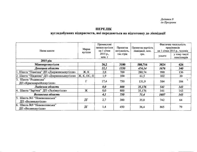 Згідно з програмою «Державна цільова економічна програма реформування вугільної промисловості на 2015-2020 роки» (ліквідації вугільної галузі) передбачено зупинити та закрити 34% діючих державних шахт до кінця цього року. Серед них - дві шахти Нововолинська.
