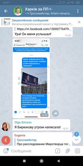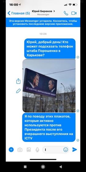 Так, Ольга Сімсон написала раднику президента Юрію Бірюкову з проханням прокоментувати політичну рекламу. «Юрій, добрий день! Хто може підказати телефон штабу Порошенко в Харкові. Я з приводу цих плакатів, які активно використовуються проти Президента після його вчорашнього виступу на ICTV», – написала жінка.