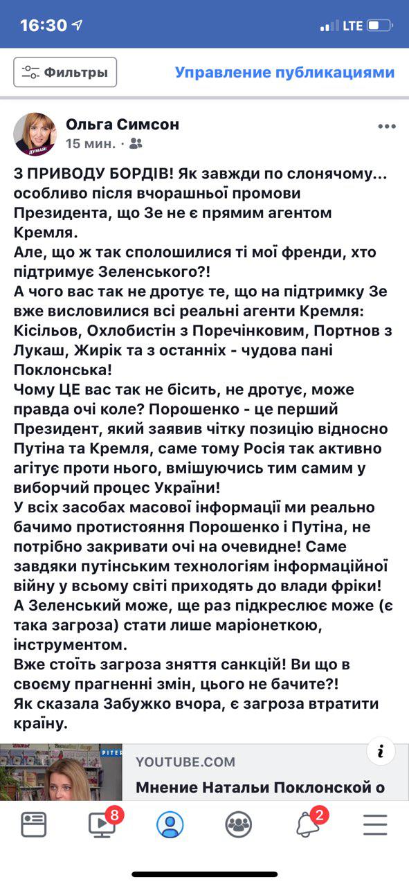 «Якось так», – Ольга Сімсон демонструє іншим «порохоботам» зроблений на швидку руку пост, що відбілює Петра Порошенка.