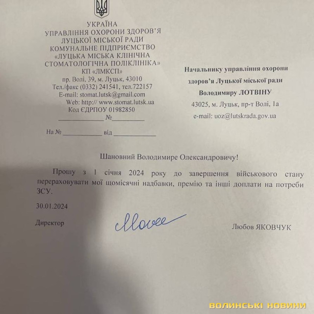 Директорка Луцької стоматполіклініки до закінчення війни переказуватиме ЗСУ всі надбавки і премії