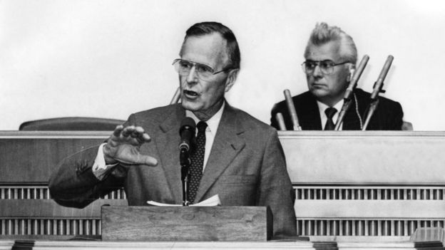 Особливо пана Буша запам'ятали українці - за кілька тижнів до проголошення незалежності у серпні 1991 року він приїхав до Києва і у своїй знаменитій промові закликав Київ не відокремлюватись від Москви.