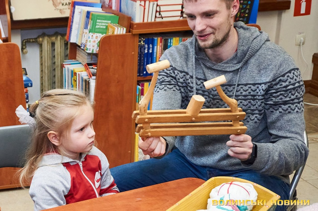 Ігротека розпочалася зі вступного слова художниці та майстрині Ірини Сардак-Бондарук. Вона розповіла про те, що «іграшковою» темою зацікавилася давно. А на ідею сьогоднішнього заходу її наштовхнуло відоме фото юної Лесі Українки з грабельками у руках.Тема дослідження старовинних забавлянок близька ще одному постійному учаснику суботніх зустрічей — Андрію Бондаруку. Спеціаліст із народної творчості, етнограф та майстер на всі руки, він з юних літ цікавився секретами створення іграшок та колекціонував їх. А з часом, власними руками, почав відтворювати. У доробку майстра не лише репліки. Як розповідає Андрій, не завжди вдавалося дізнатися, як була влаштована іграшка. Інколи доводилося створювати її авторські варіації.Діти та дорослі із захопленням слухали розповіді про кожну із забавлянок. Які, до речі, спеціалісти виокремлюють у великі групи. Перша — іграшкові знаряддя праці. Друга — шумові іграшки. Третя — розвиваючі іграшки, Четверта — іграшкові меблі. П’ята — транспортні засоби.Після цікавої лекції, учасники ігротеки мали можливість не лише роздивитися, але й погратися усіма цими брязкальцями, вуркалами, дзигами, деркачами, молоточками, тарілочками, колисками, кониками на коліщатах, грабельцями, ляльками і човниками.Андрій Бондарук зауважує — лесиними іграшками усе представлене називається не випадково. Майстер розповідає про нашого земляка з Ковеля Івана Сидорука. Добре відомий, як знавець ремесел, він також відтворює старовинні забавлянки. І саме від нього Андрій не лише перейняв любов до саморобок, але й почув слова, що все це: «іграшки Лесі Українки».Не варто забувати і те, що мама поетеси — Олена Пчілка — дуже багато зробила для збереження народної культури. Тому цілком вірогідно, що маленька Леся гралася експонатами родинної колекції, серед якої, безперечно, були і народні іграшки.Нагадаємо, що у історичному музеї села Княгининок постійно діє експозиція старовинних іграшок. Один із її найстаріших експонатів — металеве брязкальце, датоване 1898 роком. Хоча, каже Андрій Бондарук, у колекції є і керамічні свищики, орієнтовно XVIII сторіччя. Однак точно встановити їх вік майже неможливо.