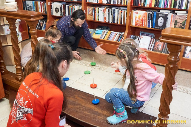 Традиційна дитяча субота у книгарні «Є» сьогодні, 22 лютого, пройшла у форматі ігротеки. Її учасники мали нагоду побачити, як у давні часи проводили своє дозвілля діти.