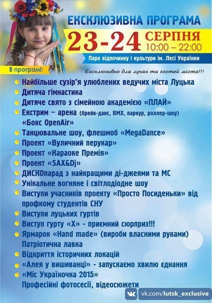 Ексклюзивну програму святкування серпневих свят для лучан і гостей міста пропонує об'єднання хороших людей «Луцьк_Ексклюзив». Про це йдеться на сторінці спільноти у соціальній мережі.