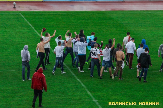 ФК «Волинь» остаточно програє «Дніпру», по фінальному свистку на поле вибігають фанати в балаклавах і біжать в сторону футболістів після чого… дають їм «п’ять»! Під час цього постраждав лише один рекламний банер, на який заскочили фанати, коли повертались на свій сектор.