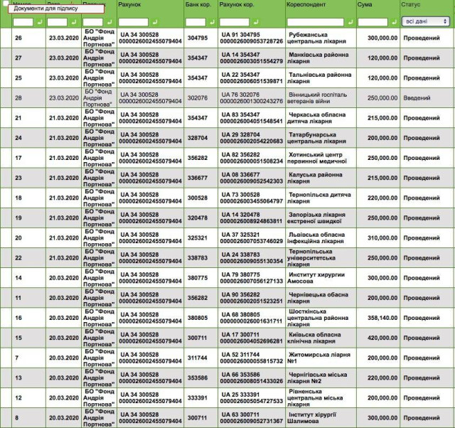 Як зазначив Портнов, фонд поповнювався коштами від різних людей, про тих, хто не буде заперечувати, обіцяють розповісти згодом. Загалом на допомогу медзакладам пішло трохи більше 6 мільйонів гривень – кошти передавали безпосередньо в лікарні, які найбільше потребують засобів індивідуального захисту для протидії епідемії.