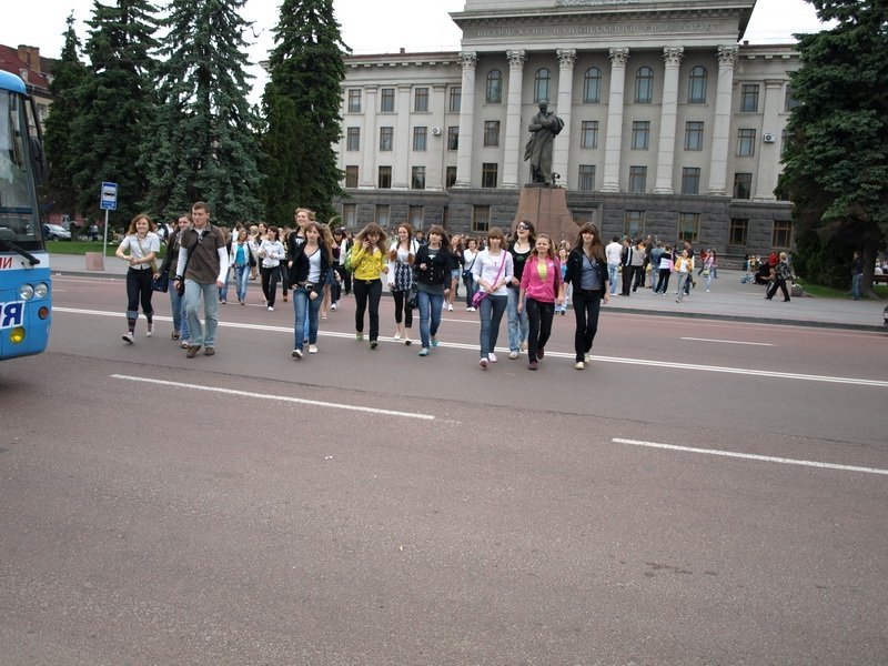 парад??? якщо якийсь чувак сказав йдем до головного корпусу вну, а частина взагалі не почула і не зрозуміла і лишилась на майдані. а купатись у фонтані теж парад? а той парад узгоджували з місцевою владою? можливо те що ви не розійшлись кожен в свою сторону і не відповідає умовам флеш-мобу, але в парад це геть не вписується