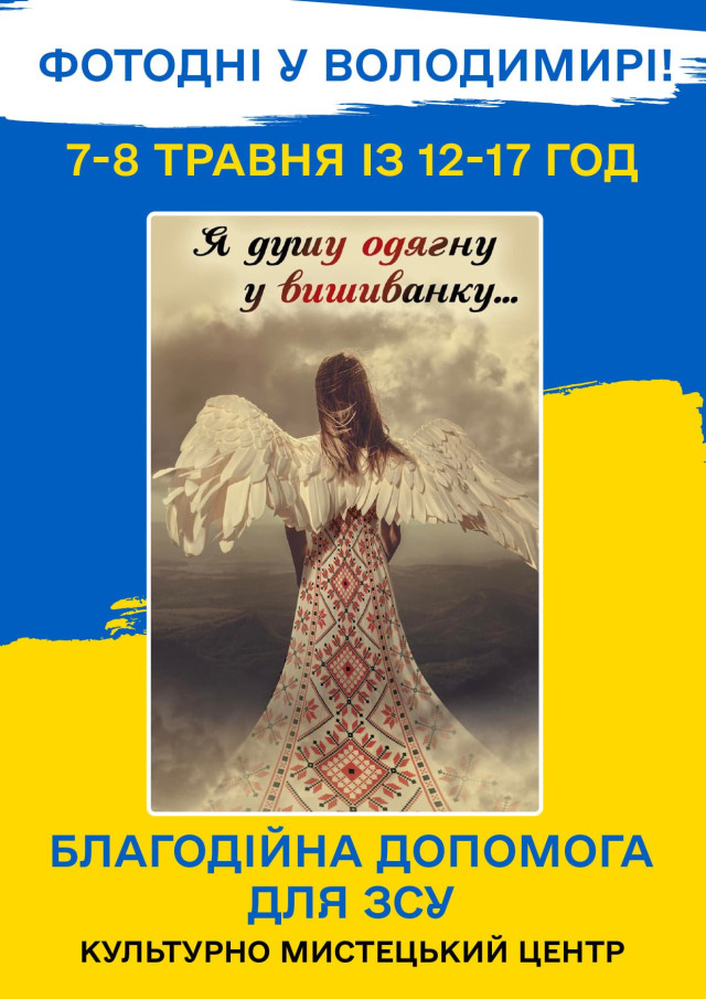 7 та 8 травня з 12-ї до 17-ї години поблизу культурно-мистецького центру у Володимирі працюватимуть фотозони, де кожен охочий зможе зробити світлину на згадку, зробивши благодійний внесок для підтримки українських захисників.
