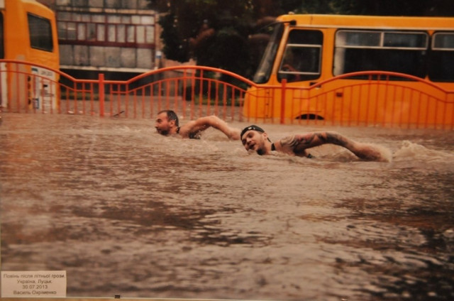 Є і три фотографії з України. Найцікавіші – це два хлопці-плавці у воді на вулиці на фоні жовтих маршруток у Луцьку. Фото зроблене цього річ після липневої грози.