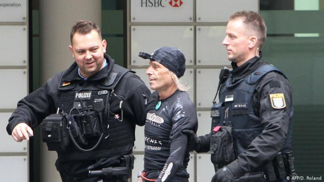 57-річний французький скелелаз Ален Робер, якого прозвали «людиною-павуком», піднявся на хмарочос Skyper у Франкфурті-на-Майні, після чого його затримала поліція.