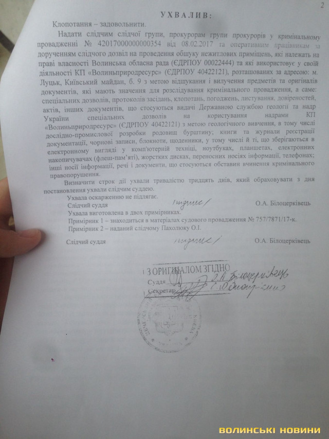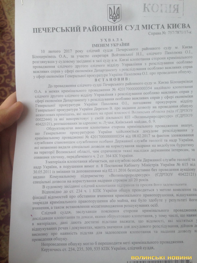 Голова фракції «УКРОП» в обласній раді Вячеслав Рубльов, який на момент візиту перебував в раді, повідомив, що «славнозвісну» ухвалу видавав Печерський суд, склад якого не мінявся за останні 10 років. Зі слів депутата, слідчих цікавили виключно документи, що стосуються бурштину, а не міді чи інших корисних копалин.Зі слів Вячеслава Рубльова, обвинувачення в тому, що видача дозволів на видобуток для «Волиньприродресурсу» може спричинити «тяжкі наслідки державним інтересам», виглядають безпідставно. Адже «Волиньприродресурс» - єдине в країні комунальне підприємство, яке отримало такий документ. Бо в сусідній Рівненській та Житомирській областях, де триває незаконний видобуток, дозволи дають приватним фірмам.