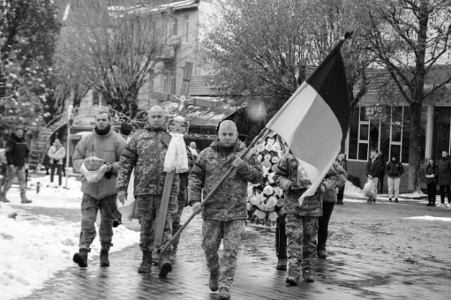 Після завершення панахиди домовину з тілом Героя прощальною ходою пронесли Театральним майданом. Біля фотостенду “Герої Небесної Сотні – Загинули за єдність України” скорботна процесія зупинилася і виконала Державний Гімн.
